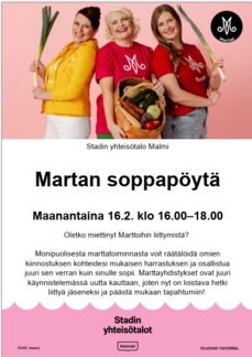 Martan soppapäivää vietetään Malmin Yhteisötalolla 16.2.2026. TERVETULOA!